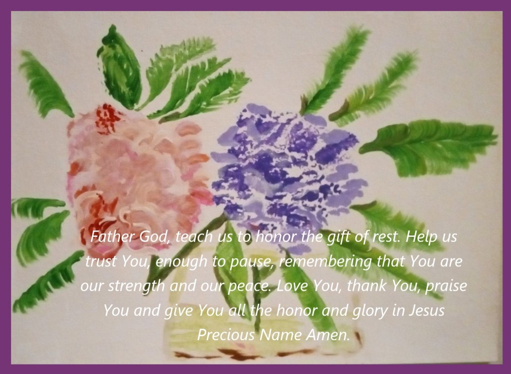 Father God, teach us to honor the gift of rest. Help us trust You, enough to pause, remembering that You are our strength and our peace. Love You, thank You, praise You and give You all the honor and glory in Jesus Precious Name Amen.