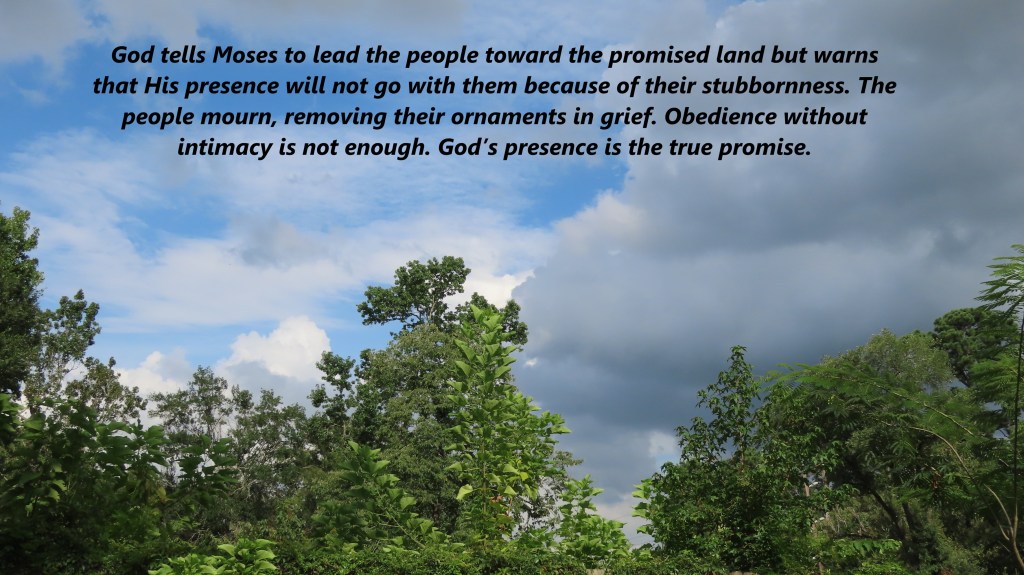 God tells Moses to lead the people toward the promised land but warns that His presence will not go with them because of their stubbornness. The people mourn, removing their ornaments in grief. Obedience without intimacy is not enough. God’s presence is the true promise.