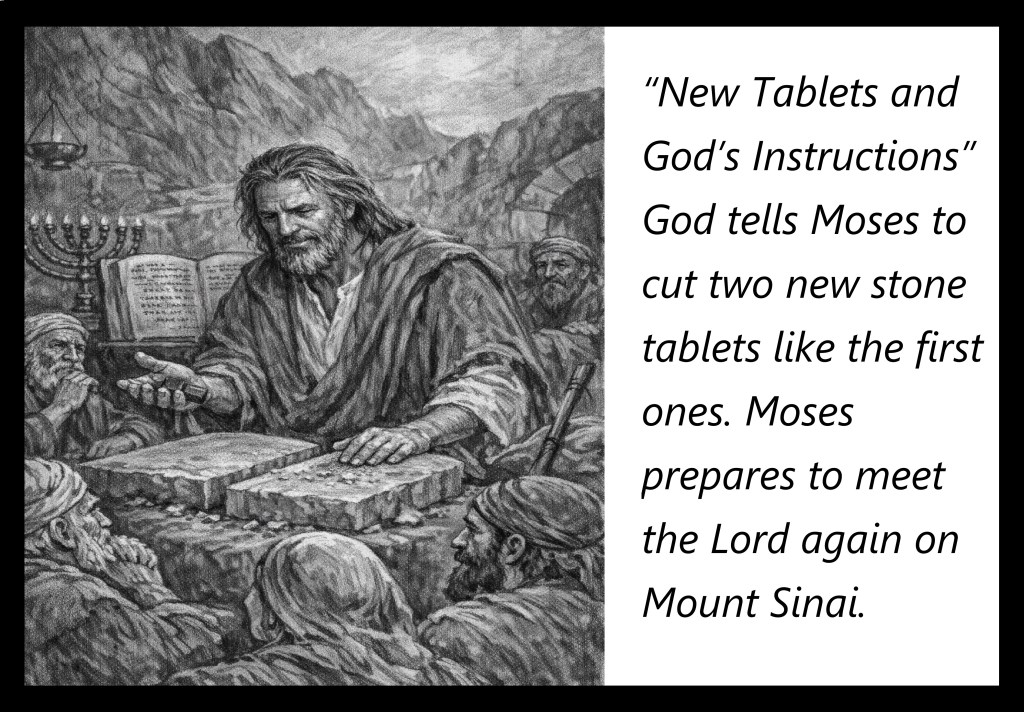 God tells Moses to cut two new stone tablets like the first ones. Moses prepares to meet the Lord again on Mount Sinai.