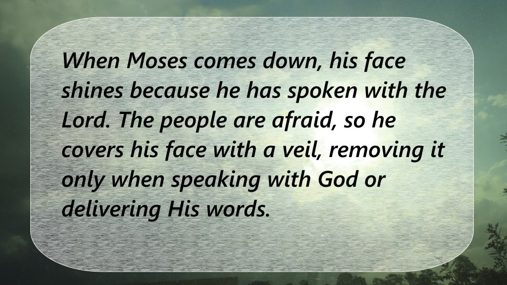 When Moses comes down, his face shines because he has spoken with the Lord. The people are afraid, so he covers his face with a veil, removing it only when speaking with God or delivering His words.