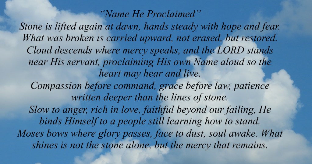 Cloud descends where mercy speaks, and the LORD stands near His servant, proclaiming His own Name aloud so the heart may hear and live.