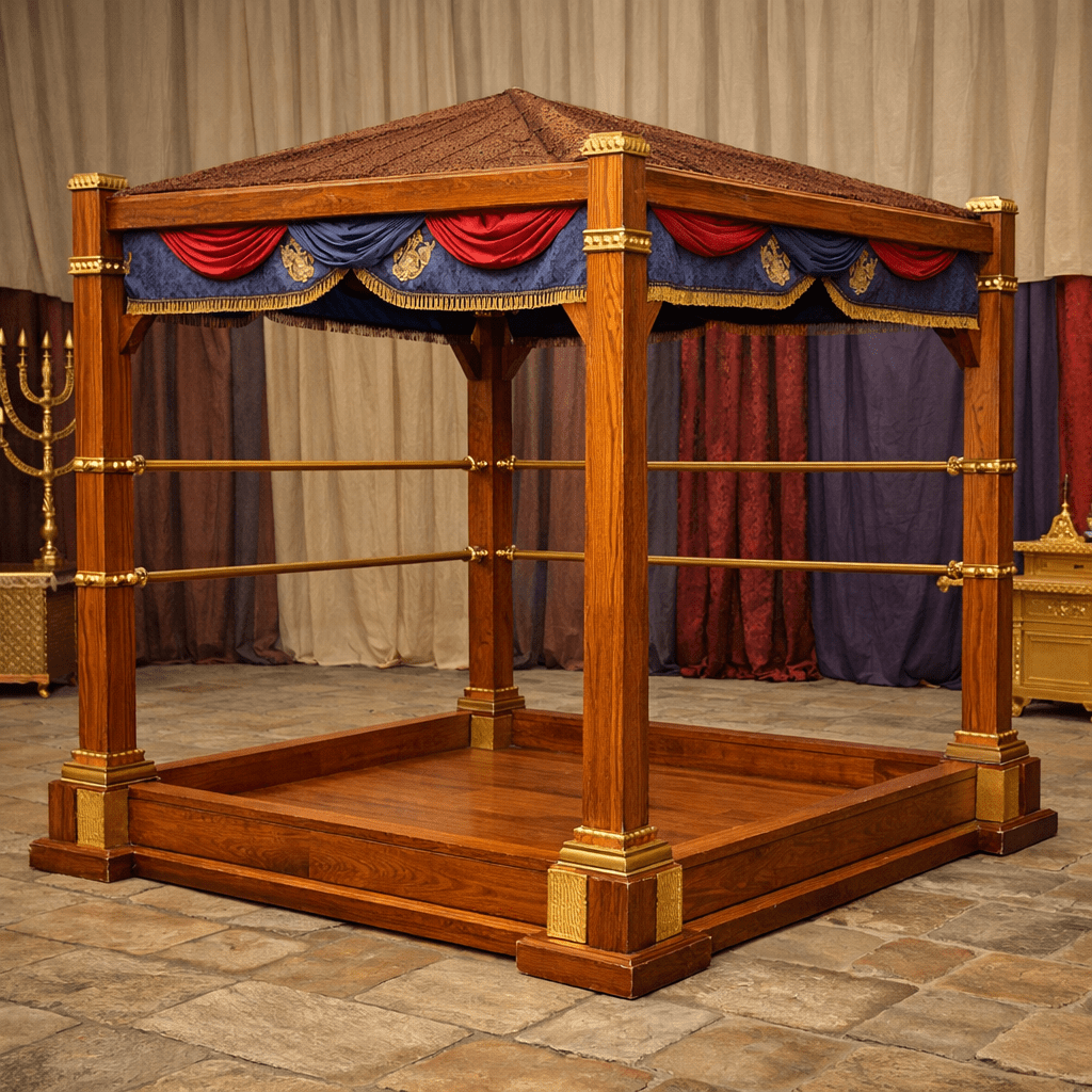 Exodus 36: 20–34They used acacia wood to make the boards that would hold up the tabernacle. Each board was 4 metres high and 65 centimetres wide. Each board had two wooden pegs, beside each other. They made all the boards for the tabernacle like this. They made 20 boards for the south side of the tabernacle. They used silver to make 40 heavy bases to hold up the boards. Two bases would hold up each board. The pegs on the boards fitted into holes in the bases. They made 20 boards for the north side of the tabernacle. They made 40 silver bases, two bases under each board.They made six boards for the west side, at the back of the tabernacle. They made two boards for the corners at the back of the tabernacle. They fixed the two boards together, from the bottom to the top. They used a ring to fix them together at the top. They made both corners in the same way. So there were eight boards at the back of the tabernacle and 16 silver bases, two bases under each board. They used acacia wood to make bars to fix across the boards. They made five bars for the south side of the tabernacle, five bars for the north side, and five bars for the west side at the back of the tabernacle. The bar that would go across the centre of the boards would reach from one end of the tabernacle to the other end. They used gold to cover the boards and to make rings for the boards. The rings would hold the bars in place across the boards. They also covered the wooden bars with gold.