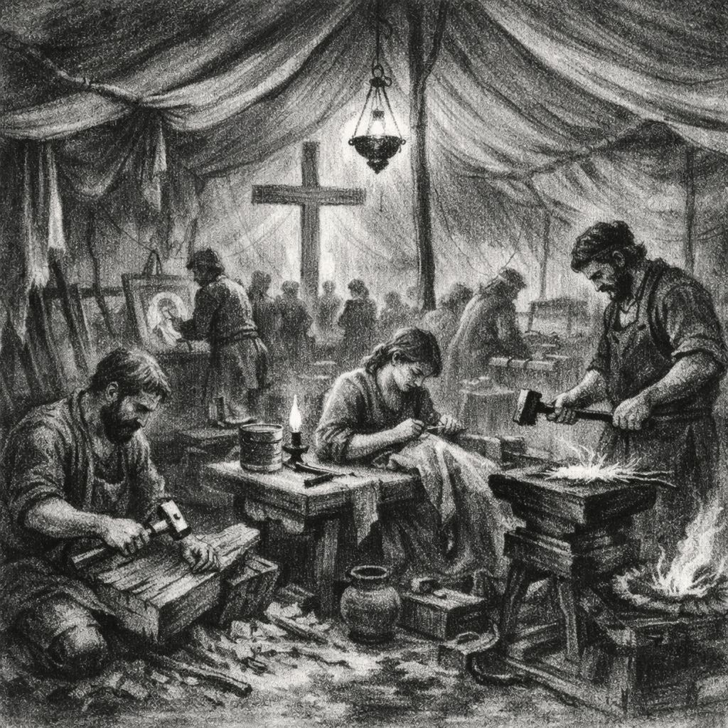 their faces caught in patient, holy craft.
