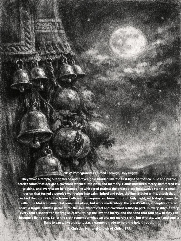 They wove a temple out of thread and prayer, gold braided like the first light on the sea, blue and purple, scarlet colors that declare a covenant stitched into cloth and memory. Hands measured mercy, hammered law to shine, and every seam held names like whispered psalms; the breast piece held twelve stones, a small design that turned a people’s wandering into calm. Ephod and robe, the linen’s quiet white, a sash that cinched the promise to the frame; bells and pomegranates chimed through holy night, each step a hymn that called the Maker’s name. Not ornament alone, but work made whole: the priest’s attire, a people’s offered heart, a fragile, faithful garment for the soul, where craft and covenant refuse to part. In every stitch a story, every fold a shelter for the fragile, fearful thing: the law, the mercy, and the hand that told how beauty can become a living ring. So let the cloth remember what we are: not merely cloth, but witness, worn and true, a light to carry, like a distant star, a garment made to hold the holy through.